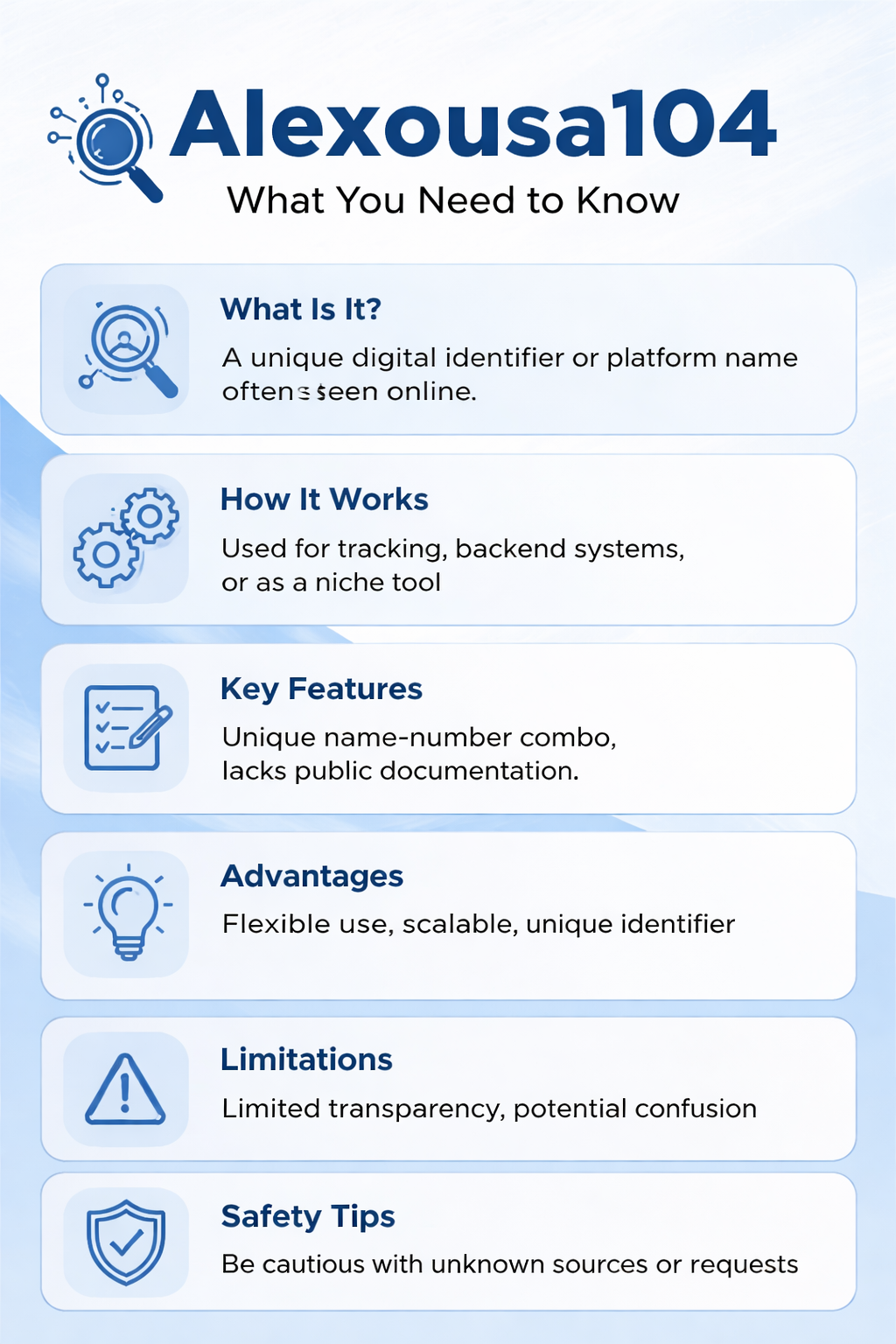 In simple terms, Alexousa104 is not a broadly defined mainstream service yet. Instead, it seems to function as a unique digital entity—possibly tied to content, accounts, or backend systems.