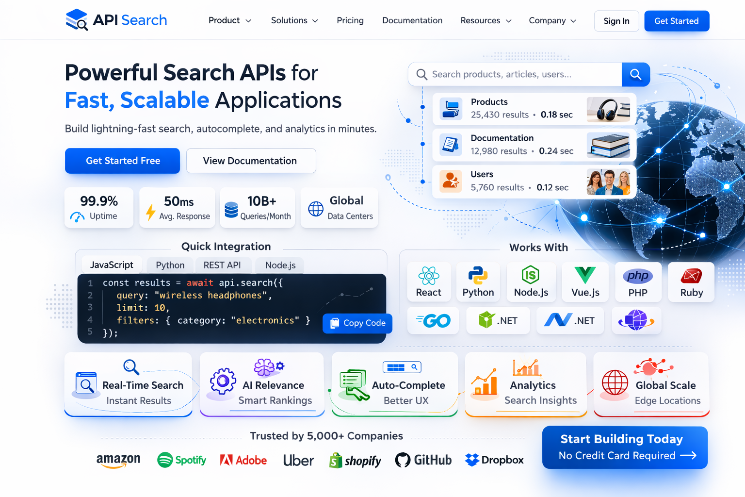 This demand has influenced how API search companies design their homepages. Performance metrics and global infrastructure maps appear more frequently now, highlighting edge servers and data centers optimized for fast response times.